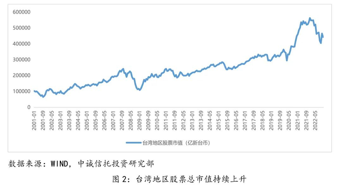 不过,A股长期以来上市标准较为严格,金融类企业占比较高,优质投资标的较为稀缺,对配置资金吸引力不足。从融资规模来看,2019年直接融资占比仅为14.73%,发达国家则接近70%;在市场结构中,央企上市公司总市值约为24.25万亿元,占A股总市值的比例约为27.4%。其中,金融类企业占据绝对比重。而包括阿里巴巴等互联网龙头在内的中资科创企业赴境外上市;从整体规模来看,2021年末,A股证券化率达到84.3%,美国同期则接近300%,日本也超过120%。随着注册制的实施,A股上市条件更加包容,市场规模有望上升,新兴行业占比将进一步提升。以台湾省为例,2006年进入“全面注册制”时期后,股票市值由2005年底的15.6万亿新台币,上升至2020年初的30.9万亿新台币。随着A股市场规模的扩大,长期收水平的提升,股票资产将成为财富管理重要的配置标的,配置比重将不断提升。