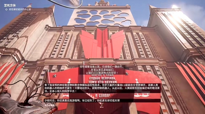 游戏中你可以看到,巨大的伟人雕像直入云霄、未来主义大楼插满了鲜红的旗帜、无数声的“同志”响彻云霄,在这里苏联完成了社会主义的最终形态,一个理想化的乌托邦世界呈现玩家面前。