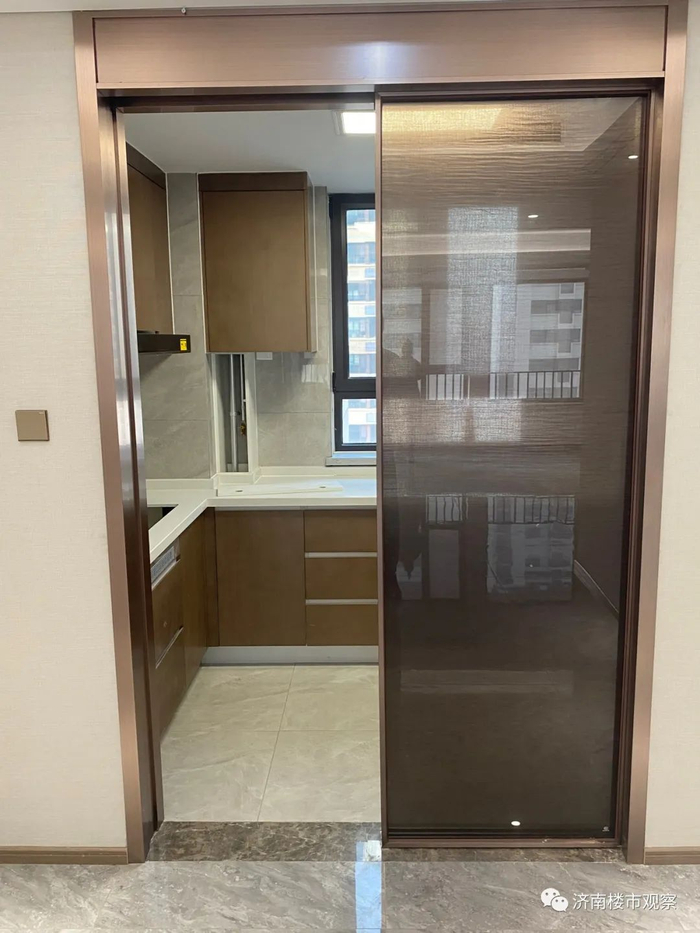 比如,它的厨房设置了吊轨推拉门,卫生间入口附近设置了感应小夜灯,厨房配备了油烟机、燃气灶、不锈钢水槽、抽拉式水龙头等,屋内所有窗户都采用了三腔两中空玻璃,卫生间的窗户窗户进行了磨砂处理,卫浴处地面进行了防滑处理,等等。