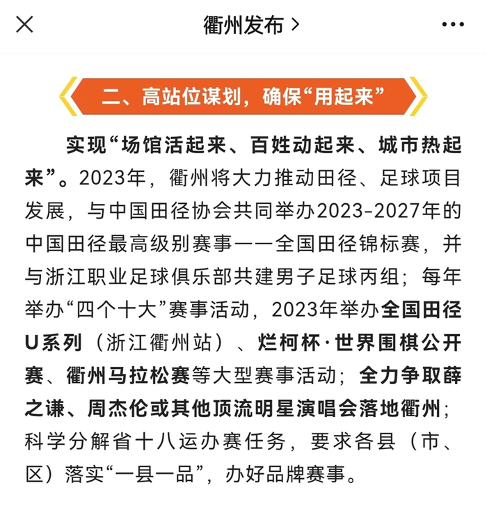 以前述衢州周杰伦演唱会为例,该消息源自今年1月衢州市体育局的一篇文章。文章中,衢州市体育局表示,2023年除了举办田径、围棋、马拉松等大型赛事活动外,还将全力争取薛之谦、周杰伦或其他顶流明星演唱会落地衢州。