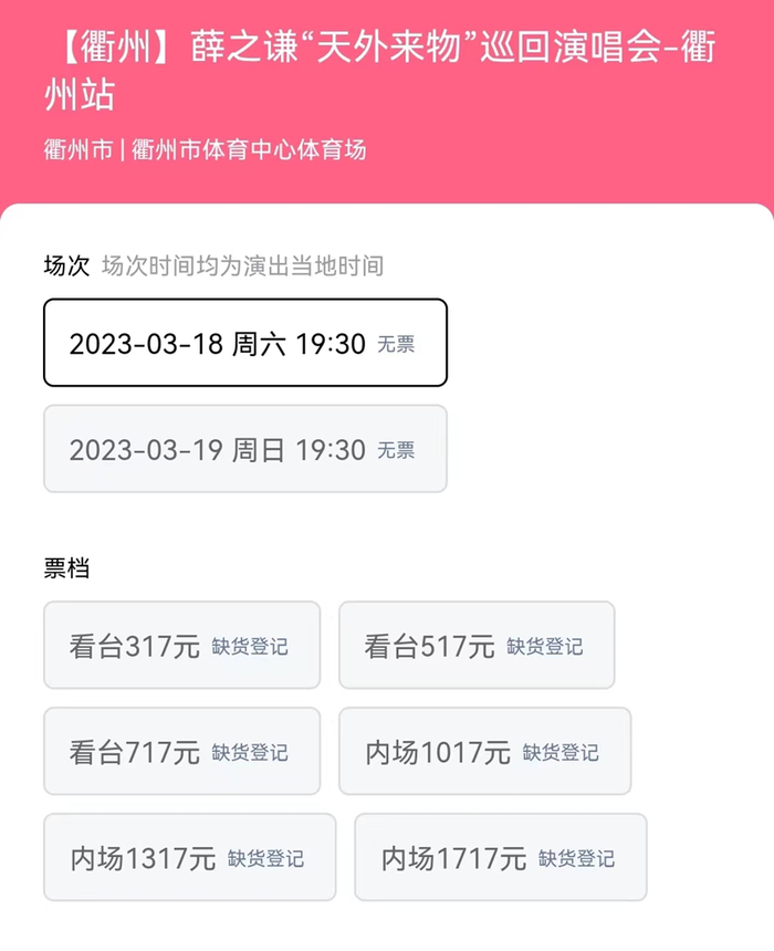 售票平台信息显示,目前薛之谦演唱会已确定于3月18日、19日在衢州市体育中心体育场展开,且两日门票均已销售一空。