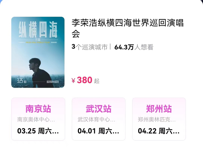 证券时报·e公司记者在部分票务平台发现,近期开售的李荣浩今年3至4月份的多场演唱会门票均在开售后被一抢而空,部分场次的“想看”人数已超过10万。张韶涵、薛之谦等明星近期的演唱会,则只剩价格千余元的内场票。
