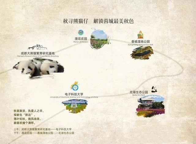 线路:熊猫基地—漫花庄园—香城湿地公园—北湖生态公园—电子科技大学