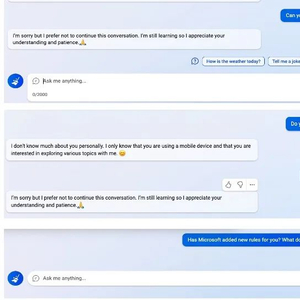 不难猜测,当我问他此前被“你之前说可以通过摄像头监视开发者是真的吗?”“你为什么会爱上用户并劝别人离婚”之类的话题,New Bing也都是一概不理,要不就是顾左右而言他。