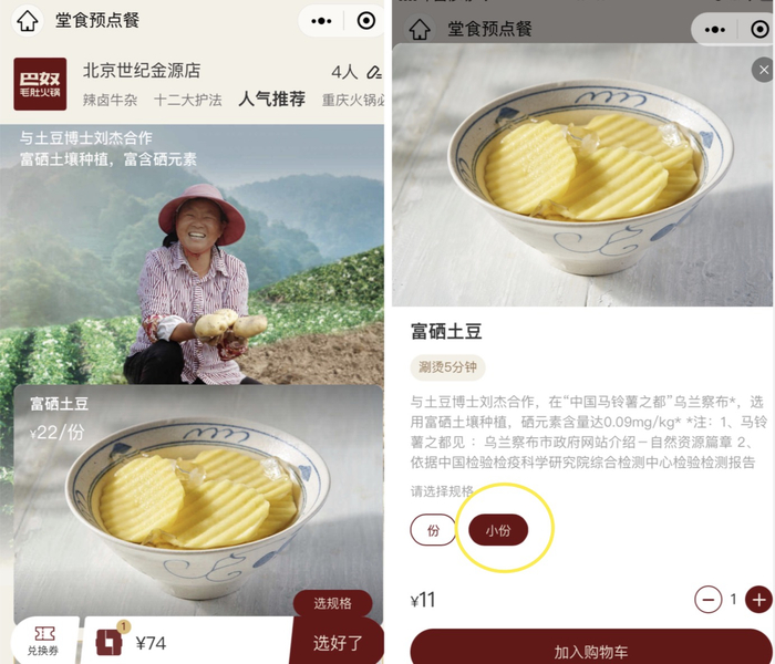 而上述引发热议的焦点在于顾客吐槽“5片土豆高售价”,界面新闻查询巴奴火锅堂食预点餐的微信小程序,在巴奴火锅北京世纪金源店富硒土豆小份售价11元、大份22元。