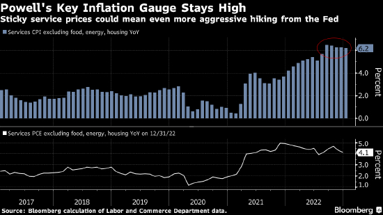 美联储过去一年已经将基准利率提高4.5个百分点,升息力度达到几十年来最大。但是,超核心通胀率的每一个指标都显示通胀仍然过热,市场现在预计美联储今年将至少再加息75个基点,政策利率区间的上端将达到5.5%。
