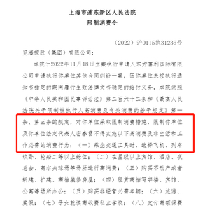 据中国执行信息公开网,上海市浦东新区人民法院2月22日发布的限制消费令显示,在东方富利国际有限公司与览海控股(集团)有限公司(以下简称“览海控股”)相关合同纠纷案中,因览海控股未按执行通知书指定的期间履行生效法律文书确定的给付义务,对览海控股采取限制消费措施,限制览海控股及览海控股法定代表人密春雷不得实施高消费及非生活和工作必需的消费行为,其中包括,乘坐交通工具时,选择飞机、列车软卧、轮船二等以上舱位等。