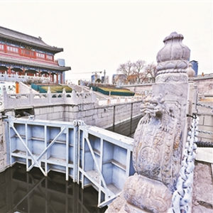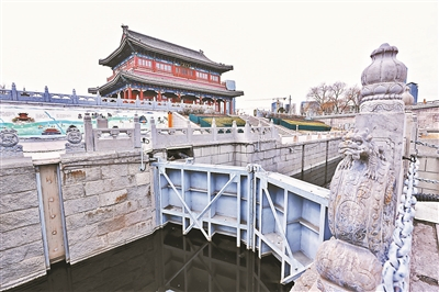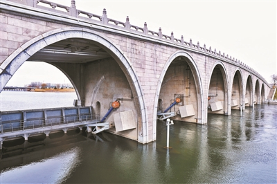 | 七孔桥下“隐藏”着北关拦河闸,常年小开度提闸,确保下游河道保持通航水位 |