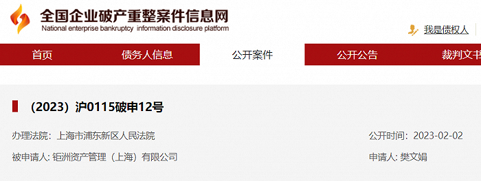 近日,据全国企业破产重整案件信息网披露的信息,知名私募机构“钜洲资产管理(上海)有限公司”(下称钜洲资产)被其基金投资人申请破产。相关信息的公开日期为2023年2月2日,申请人为樊文娟,办理法院为上海市浦东新区人民法院。