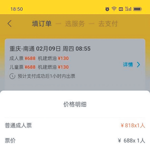 记者在王先生发来的几张当时各平台票价明细截图中看到,2月9日早上8:55的这班重庆飞往南通的国航CA4551,在国航App和携程、美团等平台上显示,成人和儿童票价均为700元。此外,成人票机建费50元、燃油费80元,总计130元;儿童票机建费0元,燃油费40元。一大一小总票价实付1570元。