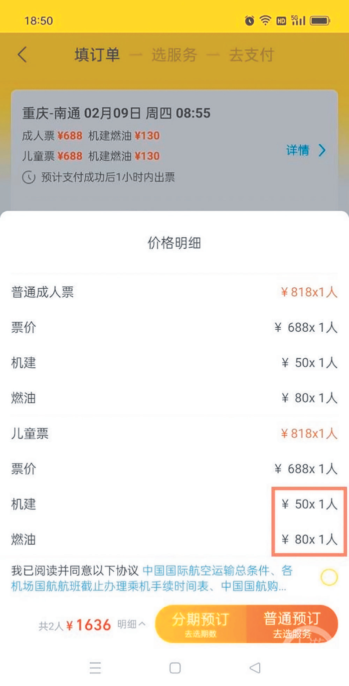 记者21日登录飞猪App,随意查询了3月1日重庆始发前往南京、温州、承德的航线,发现每条航线均有航班的确存在类似情况。以重庆-南京为例,当日该航线共有16个航班,其中有4个航班(3U8041、3U8043、3U8045和PN6289)的机建燃油费“大小同价”,均为130元,儿童并没有按照相关规定享受到优惠。