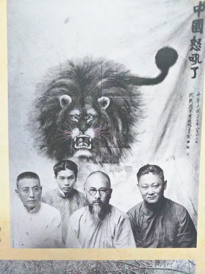 《中国 怒吼了》中画家巧妙地把画中一只威风凛凛的雄狮拟人化,脚下踏的,便是日本富士山。张善子着力用墨彩告诉世人,面对破碎的山河,睡狮醒了!中国怒吼了!此画完成后不久,张善子盛邀诸位友人到寓所小聚交流,亦请客人在自己的新作前合影留念。