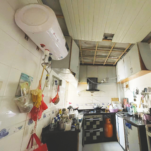 由于顶部漏水,厨房内拆除了部分损坏的吊顶,灯具也无法使用