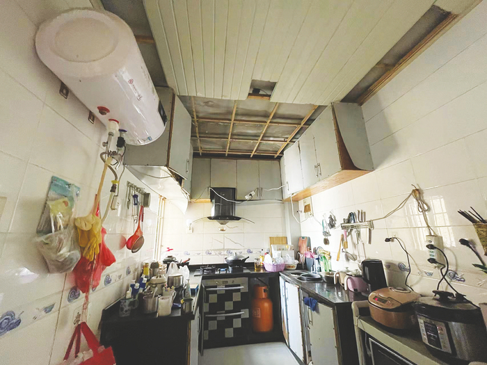 最让租户覃女士一家难以接受的是厨房处的漏水。“我上次打豆浆,刚拿出来,上面的滴水就滴到我手上。平时做菜,也是做着做着就有水从上面滴到我脖子上、头发上,一天的好心情都被破坏完了。”覃女士表示,厨房位置的吊顶和吊柜因为滴水的侵蚀,已经出现损坏情况。