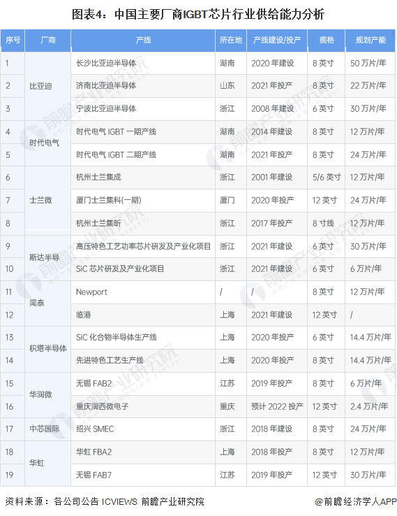 IGBT芯片产业代表性企业生产能力情况