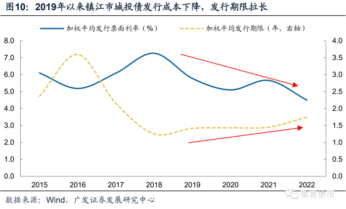 与此同时,2019年以来镇江市城投债发行成本大幅下降,并且发行期限逐年拉长,更有利于债务滚续。2016-2018年,镇江市城投债融资困难,同时伴随着发行成本迅速走高、发行期限大幅缩短的问题,2018年镇江城投债加权平均发行票面利率达到7.3%,而同期加权平均发行期限仅1.3年。2019年以来,镇江城投债发行成本整体保持下降,发行期限回升,2022年加权平均发行票面利率为4.5%,加权平均发行期限为1.7年。融资成本下降伴随融资期限结构优化是债务可持续滚续的基础,也是由短期债务管控走向长期债务化解过程中,较为理想的路径。