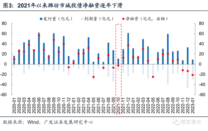 2022年,潍坊市城投债一级发行依然受阻,净融资规模相较去年同期进一步压缩。2022年,潍坊市城投债发行335亿元,净融资79亿元,其中净融资相较2020-2021年的297亿元、115亿元明显下滑。期间召开的机构对接大会虽短期有一定利好,但并没有根本上改善潍坊市的融资环境。由于潍坊市债务负担较重且区县级发债城投数量较多,受2021年城投融资政策收紧影响较大,叠加区域负面,城投债发行难度上升,2021年5月、7月、9月和10月城投债净融资均为负。2021年10月潍坊市召开机构对接大会之后,城投债净融资开始转正,但区域融资环境并没有实质改善,随后净融资额又逐月下降。