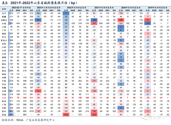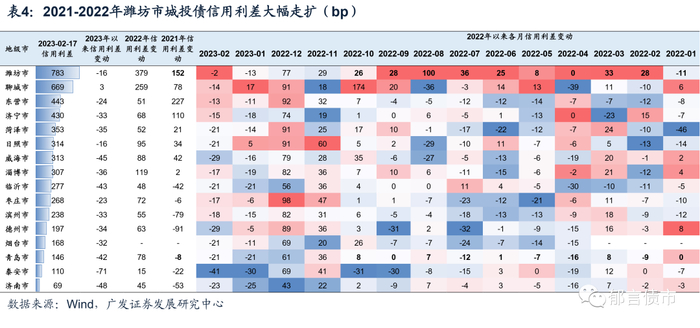 分地级市来看,2021-2022年潍坊市城投债信用利差大幅走扩,是导致山东省中低等级城投债利差延续走扩的主要原因。2021年,潍坊市信用利差走扩152bp,2022年,随着潍坊市城投平台负面不断,利差继续大幅走扩379bp,除了1月利差收窄11bp以外,其余各月利差均走扩。2023年以来,山东省各市城投债利差普遍修复,但聊城市依然走扩3bp,潍坊市利差收窄幅度也相对较小,目前利差水平为全省最高。此外,虽然青岛市绝对利差水平相对较低(146bp),但2021-2022年的表现在全省内部相对靠后。2021年,青岛市城投债利差压缩8bp,压缩幅度位于全省第6。2022年,青岛市利差走扩78bp,走扩幅度在全省排名第6。