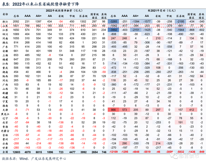 (二)2022年山东省城投债净融资下滑,主要受市级和区县级平台拖累