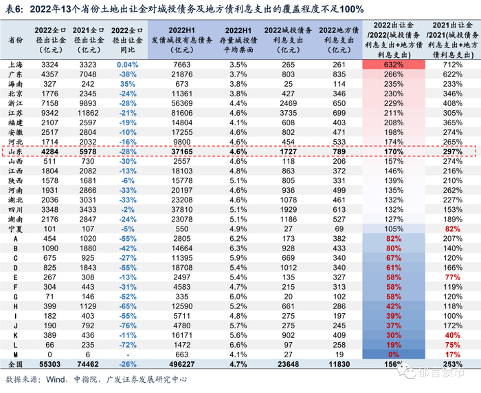 具体到如何化解城投债务风险,主要依赖三个重要变量:经济财政基本面、债务管控和金融资源。2021下半年以来,由于全国土地出让金大幅下滑,较多地方土地出让收入甚至难以覆盖债务利息,经济财政基本面有所恶化,短期或难以回暖。2022年全国实现土地出让金5.5万亿元,同比下滑26%,导致地方付息压力明显增加,2022年有13个省份土地出让金对城投债务及地方债利息支出的覆盖程度不足100%,而2021年只有5个省份。其中,2022年山东省土地出让收入为4282亿元,同比下滑28%,土地出让金对债务利息的覆盖程度从297%下降至170%。