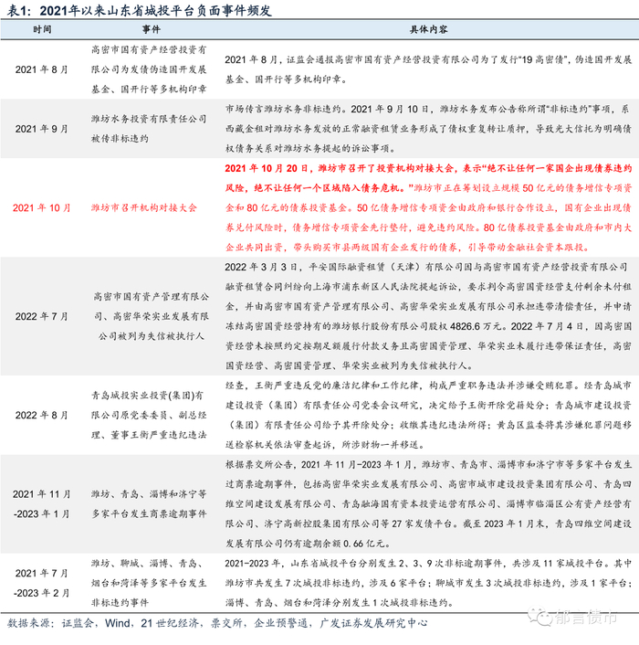 在部分区域债务压力较大的情况下,2021年以来,山东省城投非标违约和商票逾期等负面事件频发,导致区域信用环境不断恶化。2021年,山东省潍坊市城投平台多次被爆负面事件,包括高密市国有资产经营投资有限公司为发债伪造国开发展基金、国开行等多机构印章,以及潍坊水务投资有限责任公司被传言非标违约,导致潍坊市信用环境恶化。2021年10月,潍坊市召开机构大会,表示“绝不让任何一家国企出现债券违约风险,绝不让任何一个区域陷入债务危机。”并且筹划设立50亿元的债务增信专项资金和80亿元的债券投资基金。不过2022年以来,山东省城投负面信息并未减少,并且范围扩大到青岛市的城投平台,进一步引发市场担忧。
