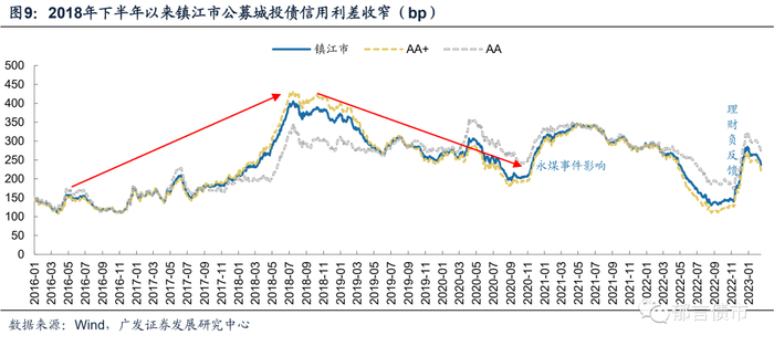 债务率高企导致市场对镇江市的认可度不断下滑,一二级市场均有所恶化,城投债净融资转负,并且公募城投债信用利差大幅走扩。2016-2018年,镇江市城投债发行疲软,而债券到期量逐年增加,导致净融资持续减少,2018年净融资转负至-193亿元。与此同时,镇江市城投债信用利差大幅走扩,从150bp左右一度走扩至400bp。