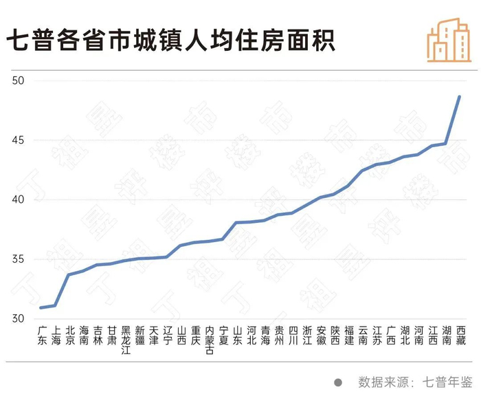 对比各省市城镇人均住房面积,可以看到各地家庭户住房的平均水平差异极大。