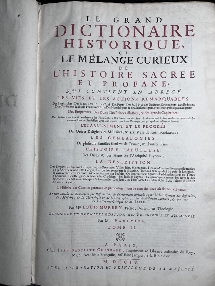 《历史大辞典:圣俗史物风趣混编,以节略的形式记述〈旧约〉的族长、法官(juges)和国王、教会的教宗、东正教的圣父和圣师、四大教会的主教、著名的枢机主教、高级教士以及异教徒的生平。记述罗马、希腊、日耳曼地区、异教徒、基督徒和奥斯曼帝国的皇帝生平,记述国王、杰出的君主和伟大军官、古代和现代的希腊语和拉丁语作者、哲学家、艺术发明家的生平……包括:描绘国家、帝国、王国、外省、城市、岛屿、山脉和新旧世界的大江大河,人们会准确地看到边界,发现地方的情况与状况、风俗、习惯以及政体与宗教。伴随着记述大公会议和特殊公会议、教会会议、伪教会会议以及其他宗教会议,谈论举办这些会议的城市。宗教律令和军事命令的名称、建立及其传播,以及其创始人的生活。此外还有古代异教的诸神和英雄的神话故事。整本书充满了奇怪的评论与专论,既是为了澄清年代学的苦难,也为了解决历史争论》(Le Grand dictionnaire historique ou le Mélange curieux de l’histoire sainte et profane, rapportant en abrégé, les Vies des patriarches, Juges et rois de l’Ancien Testament, des Souverains pontifes de l’Église, des saints Pères et docteurs orthodoxes, des évêques des quatre églises patriarcales, des cardinaux et prélats célèbres et des hérésiarques. Celles des Empereurs de Rome, de Grèce, d’Allemagne, païens, chrétiens et Ottomans, des rois, des princes illustres, et des grands capitaines, des auteurs grecs et latins, anciens et modernes, des philosophes, des inventeurs des arts […] contenant : la description des États, Empires, Royaumes, Provinces, Villes, Îles, Montagnes et Fleuves considérables de l’ancienne et nouvelle géographie, où l’on remarque exactement les bornes, la situation et les qualités des pays, les mœurs, les coutumes, le gouvernement et la religion des peuples. Avec l’histoire des Conciles généraux et particuliers, synodes, conciliabules, et autres assemblées ecclésiastiques, en parlant des villes où elles ont été tenues. Le nom, l’établissement et la propagation des ordres religieux, et militaires, et la vie de leurs fondateurs. Et l’histoire fabuleuse des dieux et héros de l’Antiquité païenne. Le tout enrichi de remarques et dissertations curieuses, tant pour l’éclaircissement des difficultés de chronologie que pour la décision des controverses historiques)