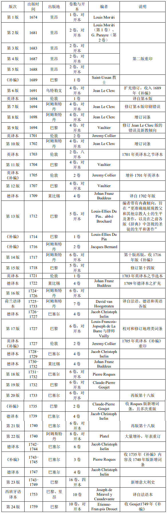 莫雷尔《辞典》的版本情况。注:表格根据Arnold Miller、Pierre Bodard 以及法国国家图书馆相关信息整理而成。