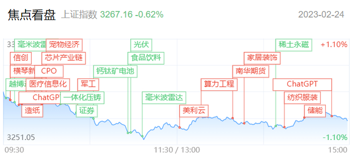 财联社2月24日讯,大盘全天震荡调整,创业板指领跌。盘面上,ChatGPT概念相关板块午后逆势活跃,算力方向拓维信息涨停,中科曙光一度涨停,CPO方向剑桥科技涨停,天孚通信涨超8%,此外人气股鸿博股份尾盘触及涨停。军工股盘中活跃,长城军工一度涨停,天和防务涨超7%。服装股尾盘异动,九牧王、牧高笛涨停。整体上市场热点较为零散,两市涨停个股仅14只。下跌方面,光伏等赛道板块集体调整,奥联电子、中英科技跌超10%。总体上个股跌多涨少,两市超2900只个股下跌。沪深两市今日成交额7258亿,较上个交易日缩量815亿。