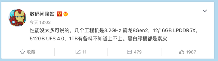 数码闲聊站暗示小米13 Ultra提供黑色、白色、绿色、橘色4个颜色都是素皮材质后盖,搭载骁龙8 Gen2 3.2Ghz版(看样子三星S23系列那颗3.36Ghz应该是三星独占~)提供12/16GB LPDDR5X+512GB UFS 4.0,1TB大存储版有备料,但不知道上不上。