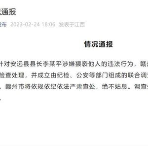 2月24日18时许,赣州市联合调查组于赣南日报社微信公众号“赣州发布”发布了情况通报称,“针对安远县县长李某平涉嫌猥亵他人的违法行为,赣州市委已对李某平作出停职检查处理,并成立由纪检、公安等部门组成的联合调查组进行立案调查。”