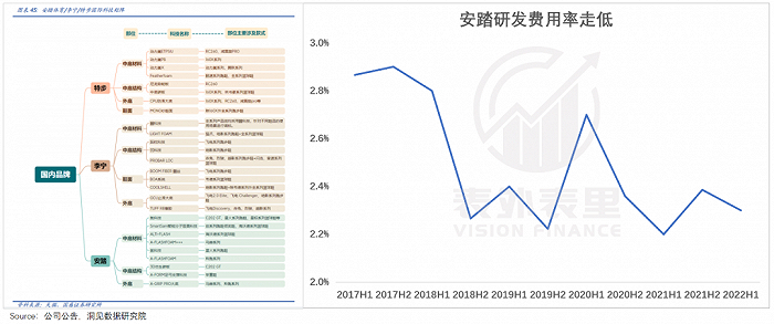 然而可以看到,FILA母公司安踏在鞋类技术产出上,对比国内其他品牌略有逊色。同时,2020H2以来,安踏的研发费用率呈现下降趋势。