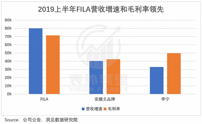 如下图,截至2019年上半年,FILA的营收增速和毛利率,远超安踏主品牌和李宁,妥妥的当红炸子鸡。