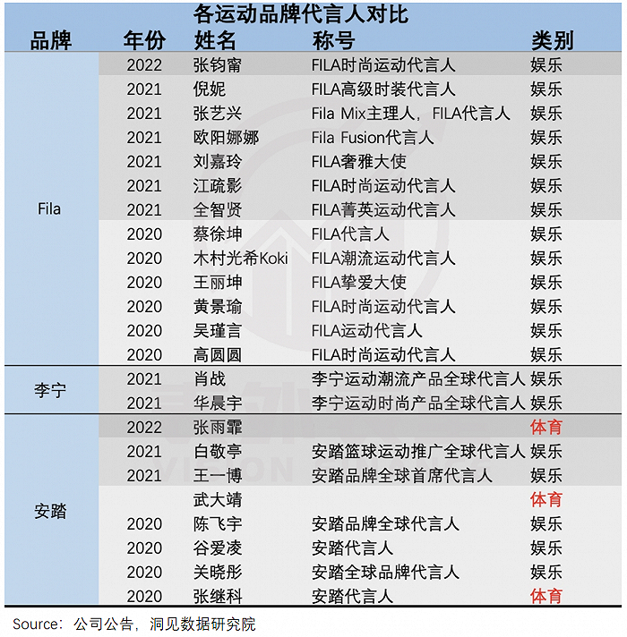 以往时尚风下,FILA的代言人矩阵以娱乐明星等为主,这无可厚非。然而新的风口战略下,加码体育资源至关重要。