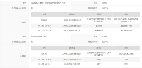 公开信息显示,锐天资产的法定代表人、董事长、总经理徐晓波,北京大学物理本科、经济双学位。2012年,他在纽约大学攻读物理学硕士后,加入知名的对冲基金Citadel Investment LLC(城堡投资)从事量化交易策略的开发和研究,据称其所在小组单日美股达到100亿美元。其后,他投身创业,于2013年底设立锐天投资。目前,锐天投资全职员工20名,均登记为基金从业人员。
