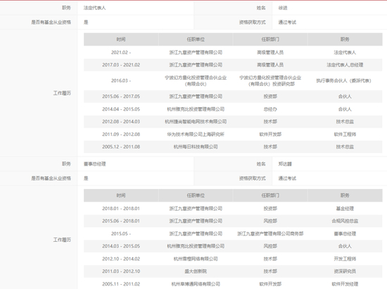 中基协备案信息显示,梁文锋曾是自由职业者,2013年创立杭州雅克比投资管理有限公司(简称:雅克比投资),2015年创立九章资产,2016年创立幻方量化。目前两家私募的全职员工分别为65名和34名,持证员工分别为50名和14名。