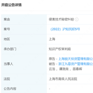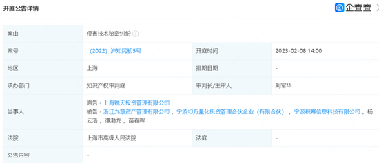 据企查查信息,(2022)沪知民初5号侵害技术秘密纠纷案,原告方为上海锐天投资管理有限公司(简称:锐天投资);被告方共有6名,包括三家机构——浙江九章资产管理有限公司(简称:九章资产)、宁波幻方量化投资管理合伙企业(有限合伙)(简称:幻方量化)、宁波积幂信息科技有限公司(简称:积幂信息)和三名自然人。