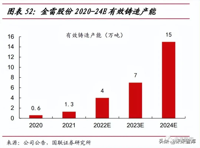 海风引领主轴锻改铸趋势。风机大型化趋势下主轴铸造工艺趋势明确,随着大 型海上风机主轴尺寸越来越大,锻造主轴因为生产设备的限制,不适用于大型风机;同时直驱和半直驱机型份额占比增加,主轴在中低速传动工况下相比于双馈高速传 动性能要求略有降低,部分风电整机供应商基于降本压力及轻量化的需求,铸造主 轴占比将有望提升。龙头金雷股份优势明显。金雷股份东营海上风电核心部件数字化制造项目也在 持续推进中,项目规划铸造产能共 40 万吨,目前一期工程已开工建设,规划产能 10 万吨,预计将于 2023 年中旬投产,贡献 50%的产能,2023 年预计公司铸造产 能有望达到 7-8 万吨,2024 年有望达到 15 万吨。