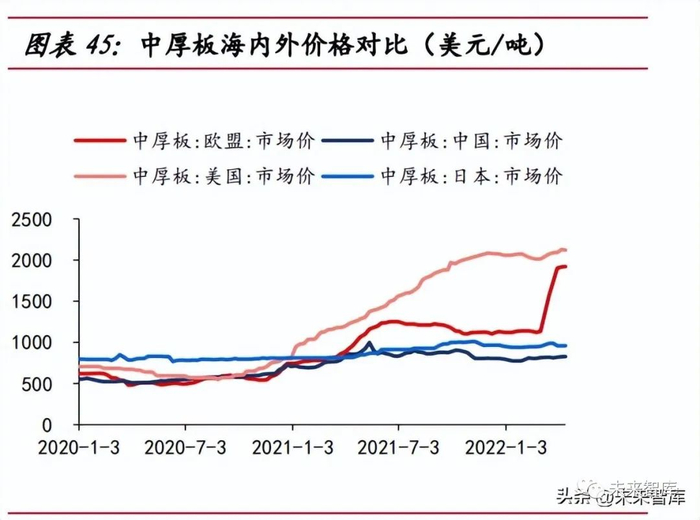 桩基无反倾销税限制,欧洲企业竞争力有限。现阶段桩基无反倾销税限制,参考 塔筒反倾销税的调查周期(约 10 年),未来 10 年有望成为桩基环节的出口黄金期。竞争对手方面,欧洲本土供应商的产能落后,欧洲本土桩基供应商产能有限,SIF、 EEW等四家主流供应商的年设计产能之和不足 600 根,且50%的产品直径小于11米, 在欧洲风机大型化趋势下,已难满足大吨重以及大直径的产品要求。塔筒出口受反倾销税影响。较低的反倾销税率能使国内塔筒企业在海外市场中拥 有更强的议价能力。现阶段,大金重工在欧盟地区的反倾销税最低为 7.2%,泰胜风能 在澳洲地区的反倾销税为零,出口优势明显。原材料价低造就竞争力。原材料价格方面,塔筒原材料主要有中厚板、法兰等, 中厚板占原材料成本的占在 80%以上, 2022 年俄乌冲突,欧洲中厚板价格一度是我 国中厚板价格的两倍,我国中厚板市场价长期低于国际市场,促使我国塔筒企业利润 率高于海外企业。