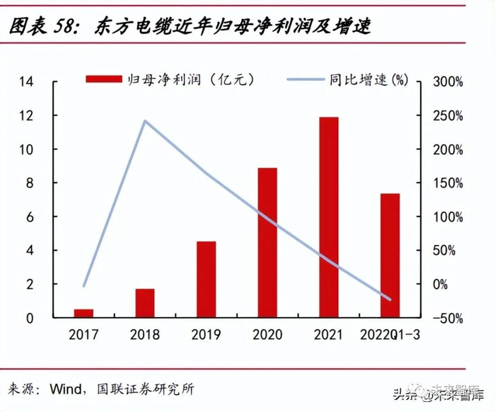 全国海缆龙头,营收利润同步增长。公司作为国内电线电缆龙头企业,业务全面 覆盖陆缆系统、海缆系统、海洋工程三大产品领域,并在高端线缆专业领域实现多项 技术突破。2022 年前三季度,公司营业收入同比下滑 1.88%,归母净利润同比下滑 23.43%, 主要由于国内海风抢装潮的结束及疫情影响需求,部分海缆项目交付延后,导致主营 业务中海缆系统收入有所下滑。