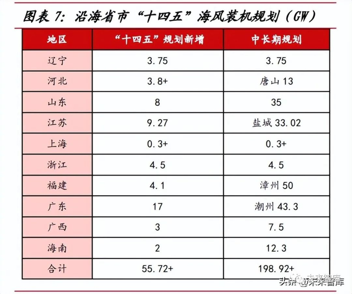 “十四五”规划充沛,中长期发展可期。截至 2022 年,我国沿海省市已发 布“十四五”海上风电发展规划,整体规划新增装机规模有望突破 55GW,2021- 22 年我国海风新增装机约 21GW,对应 2023-25 年装机规模约 34GW。考虑到部 分地区相关海风项目已实现平价上网,海风降本超预期,再结合广东、山东、浙江 等地区已出台地补政策支持海风建设,我们预计海风需求以及新增装机或超过沿海 地区规划规模,中性假设条件下,2023-25 年我国海风新增装机规模有望超 40GW, 2023 年在行业充沛的招标量下,新增装机规模有望达 10GW,同比实现翻倍增长。根据风芒能源统计,我国已出台的海上风电规划体量接近 200GW,中长期发展空 间广阔。
