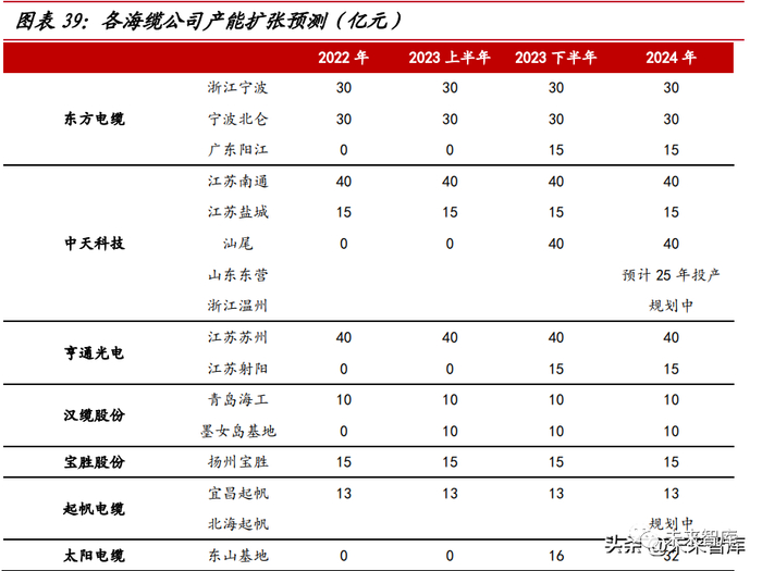 疫情因素减弱,叠加海缆较高的毛利率,海缆企业扩大产能的动机较强。东方电 缆阳江基地、中天科技汕尾基地和亨通光电射阳基地 2023 年下半年投产,预计分别 扩大产能 15 亿、40 亿和 15 亿;汉缆股份墨女岛已建成,投产时间预计在 23 年初, 扩产可达 10 亿;太阳电缆正在建设东山海缆生产基地,产能可达 32 亿。