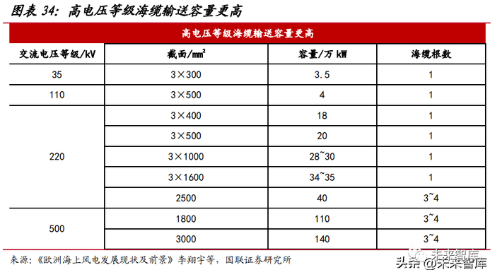 海缆对耐腐蚀、抗拉耐压、阻水防水等性能要求更高。与陆缆相比,海缆铺设于 海底,水下情况复杂,需要承受较大水压,因此必须具有良好的阻水和机械性能,防 止水分渗透导致海缆发生故障,也需要具备良好的机械性能为、防止船只锚害和洋流 冲刷,此外海缆还需具有防腐蚀、防海洋生物的能力,保障寿命。海缆趋势一:离岸距离、大兆瓦风机驱动使用高电压等级海缆。过去国内已并网 的海上风电项目离岸距离较近(30km 以内),均采用交流海缆送出方式,但随着风机 大型化、项目向深远海延伸过去,35kV、110kV 交流海缆受输送容量限制,同时铺设 海缆根数多对海底走廊有很高占用,输电损耗也较大。同输电功率的情况下,电压越高电流就越小,高压输电能减少输电时的电流从而降低因电流产生的热损耗和降低远 距离输电的材料成本。国内目前主流交流海缆电压等级为 220kV,采用单回三芯结构, 输电能力在 18~35 万 kW,高电压等级(更高 220kV、500kV)输电能力显著提高。