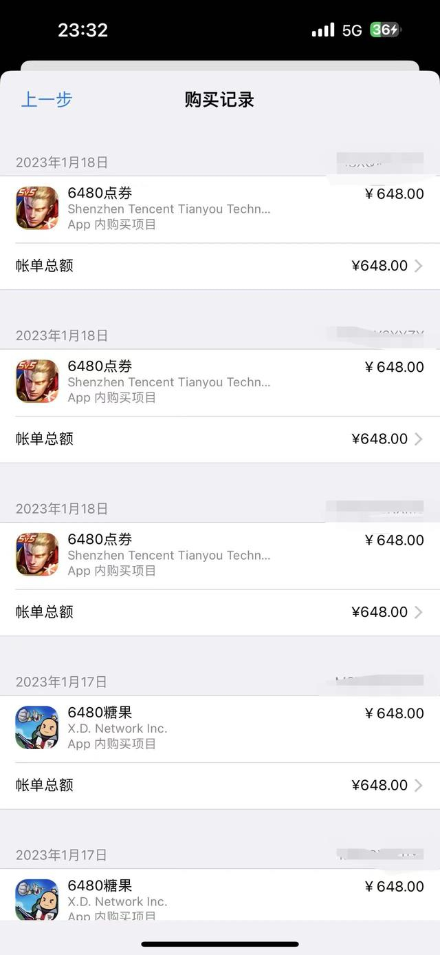 张女士介绍,她今年1月中旬翻看邮箱时发现了多笔游戏充值记录,后又发现孩子奶奶银行卡的大额消费信息。经询问得知,她12岁的儿子使用上网课的手机(该设备与家长的苹果ID绑定)在苹果App Store免密购买了三款游戏的充值内容。而孩子的苹果App Store又与奶奶的微信支付、银行卡关联。