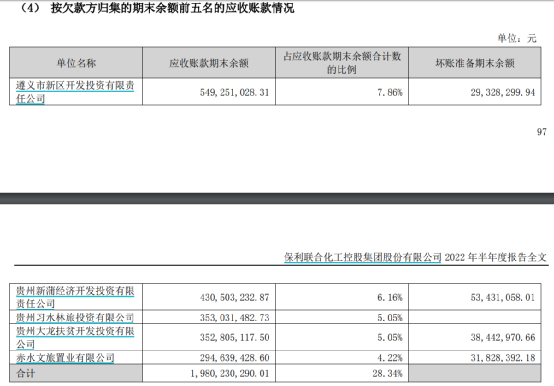 就以上文中提到的计提坏账损失9亿元的保利联合为例,它的前五大应收帐款全部来自于贵州的城投平台,占全部应收账款的比例是28.34%。