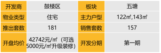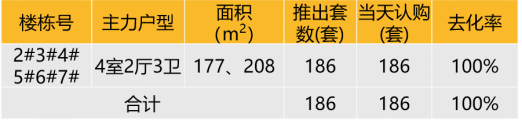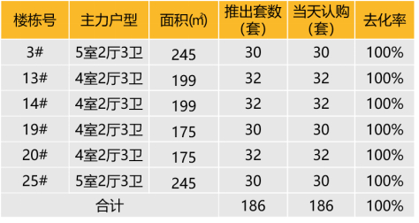 认购去化:2023年1月5日本项目推出16-17F精装中高2-7#,合计186套房源(4套样板间未推),开盘当天认购186套,去化率100%。