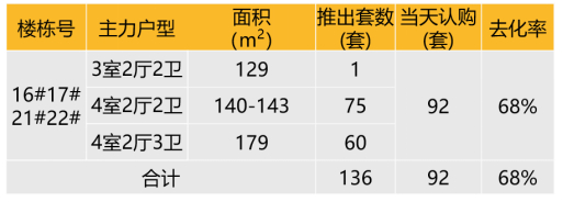 认购去化:2022年12月29日本项目推出8-10F精装洋房 16/17/21/22#,共136套,开盘认购约92套,去化率68%。
