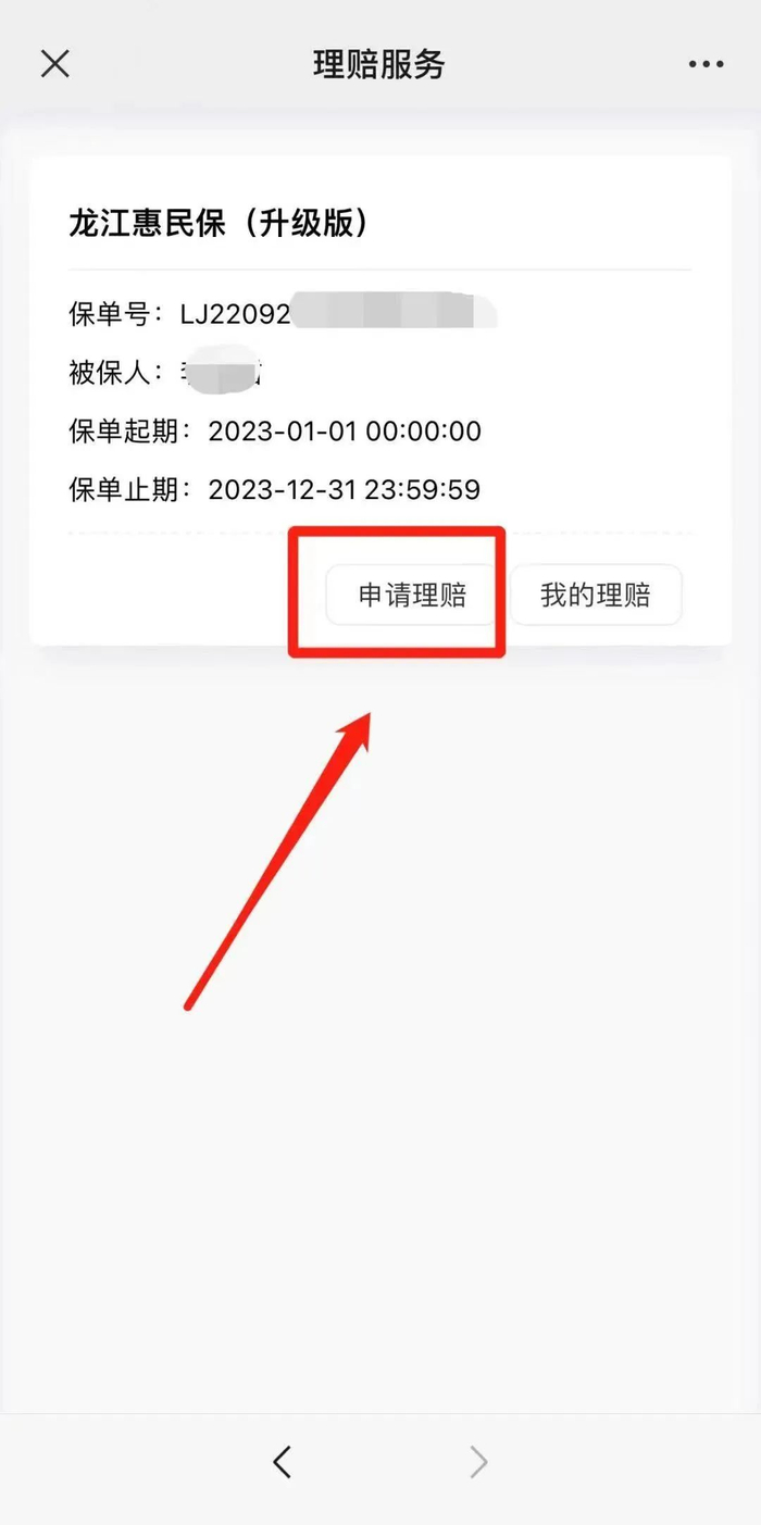 点击“龙江惠民保”菜单栏【理赔服务】——【理赔申请】。