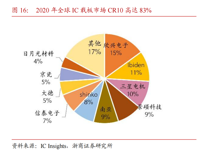 IC载板行业市场集中度较高。目前,日本、韩国和中国台湾地区的企业占据绝对领先地位,据统计,2020年全球前十大IC载板市占率约为83%,其中前三大企业为中国台湾欣兴电子、日本揖斐电、韩国三星电机,分别占据15%、11%、10%的市场份额。